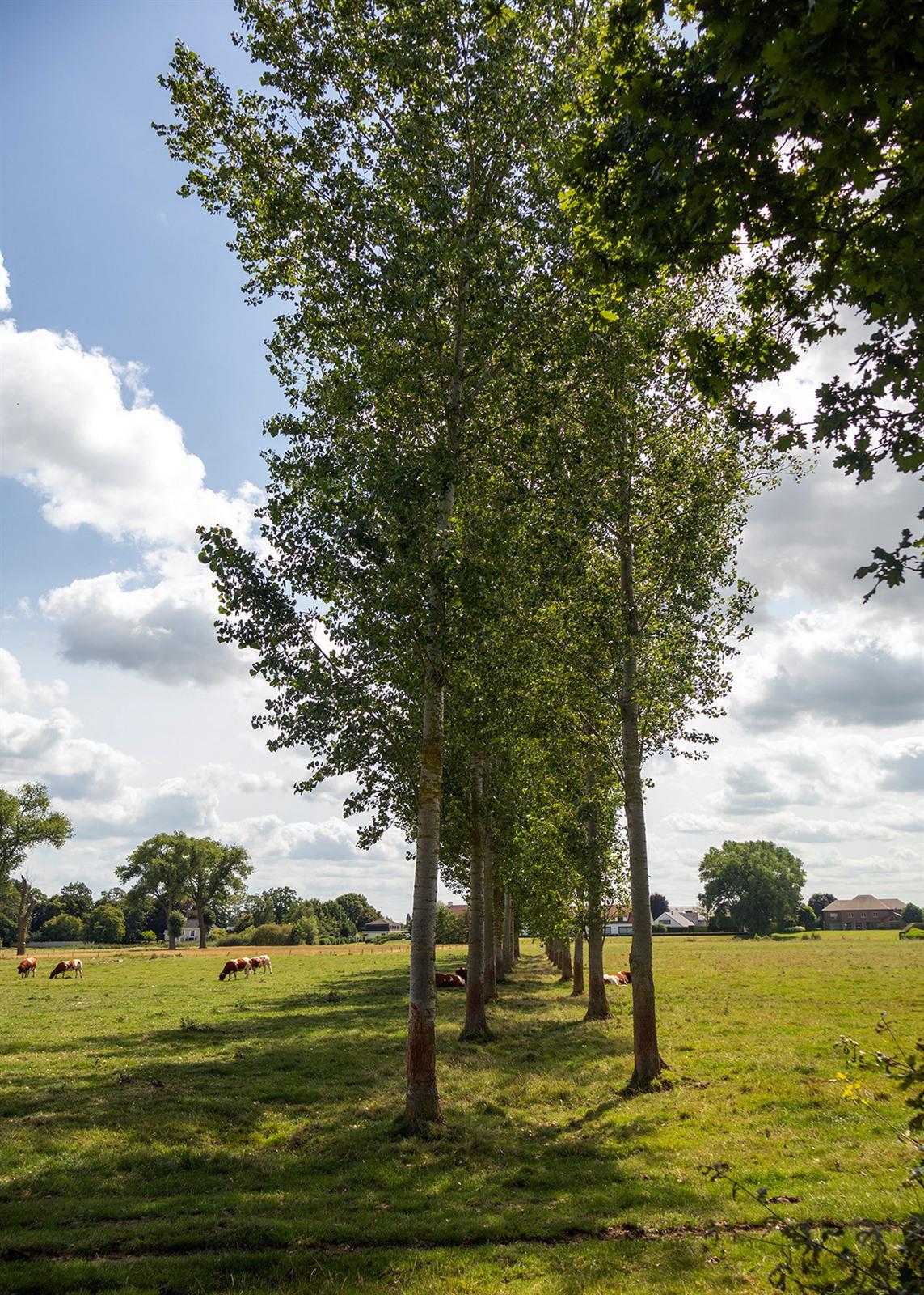 Je zet de wandeling verder via de Maaigemdijk, een onverharde weg van 1,3 kilometer. Wandel langs de hoge bomenrij en de oevers van de Oude Leie, zie de vissers bezig en neem de rust en stilte van dit idyllische stukje landschap in je op. Ongeveer in het midden van de Maaigemdijk, zie je aan de overkant van de Oude Leie, de "Grote Boom" opduiken (bekijk de ligging). Deze monumentale Canadapopulier is zo'n 30 meter hoog en heeft een stamomtrek van 7,3 meter. In 2024 deed hij mee aan de wedstrijd "Boom van het jaar" maar eindigde op de derde plaats.