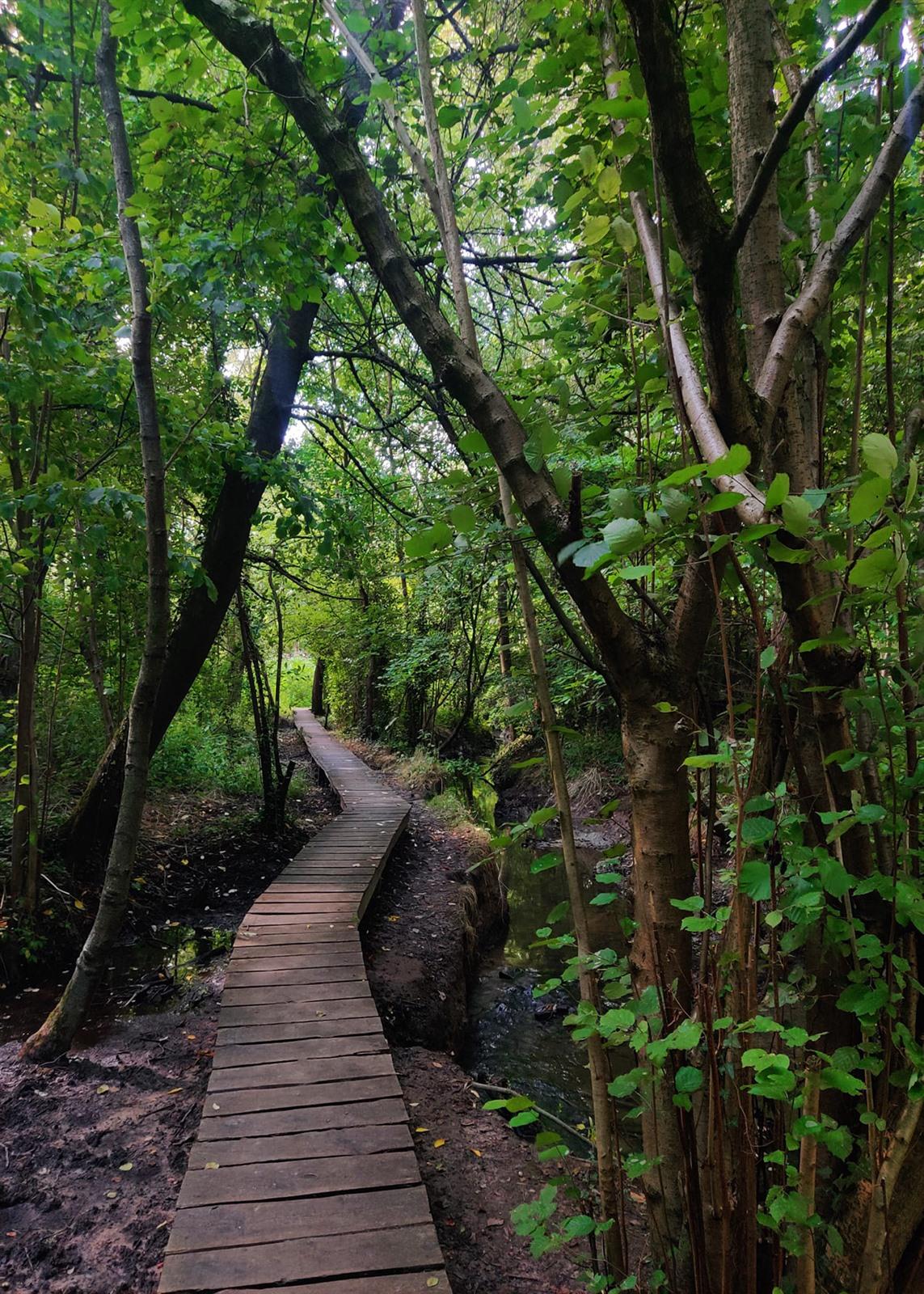 Je komt uiteindelijk uit bij de spoorweg van Moortsele. In de verte hoor je het kabbelende water van de beek die hier langs het dorpje stroomt. Wandel het bos in en volg het pad dat langs de Molenbeek loopt. Let op: na een stevige regenbui kan het hier best modderig bij liggen. Voorzie je dus best van een paar goede wandelschoenen. Op het pad ligt er ook een knuppel- en vlonderpad, een paar boomstronken die de weg versperren en hier en daar komen de koeien achter de bomen gluren. Bovendien zorgen de hoge bomen voor een lekker fris windje op warme zomerdagen!