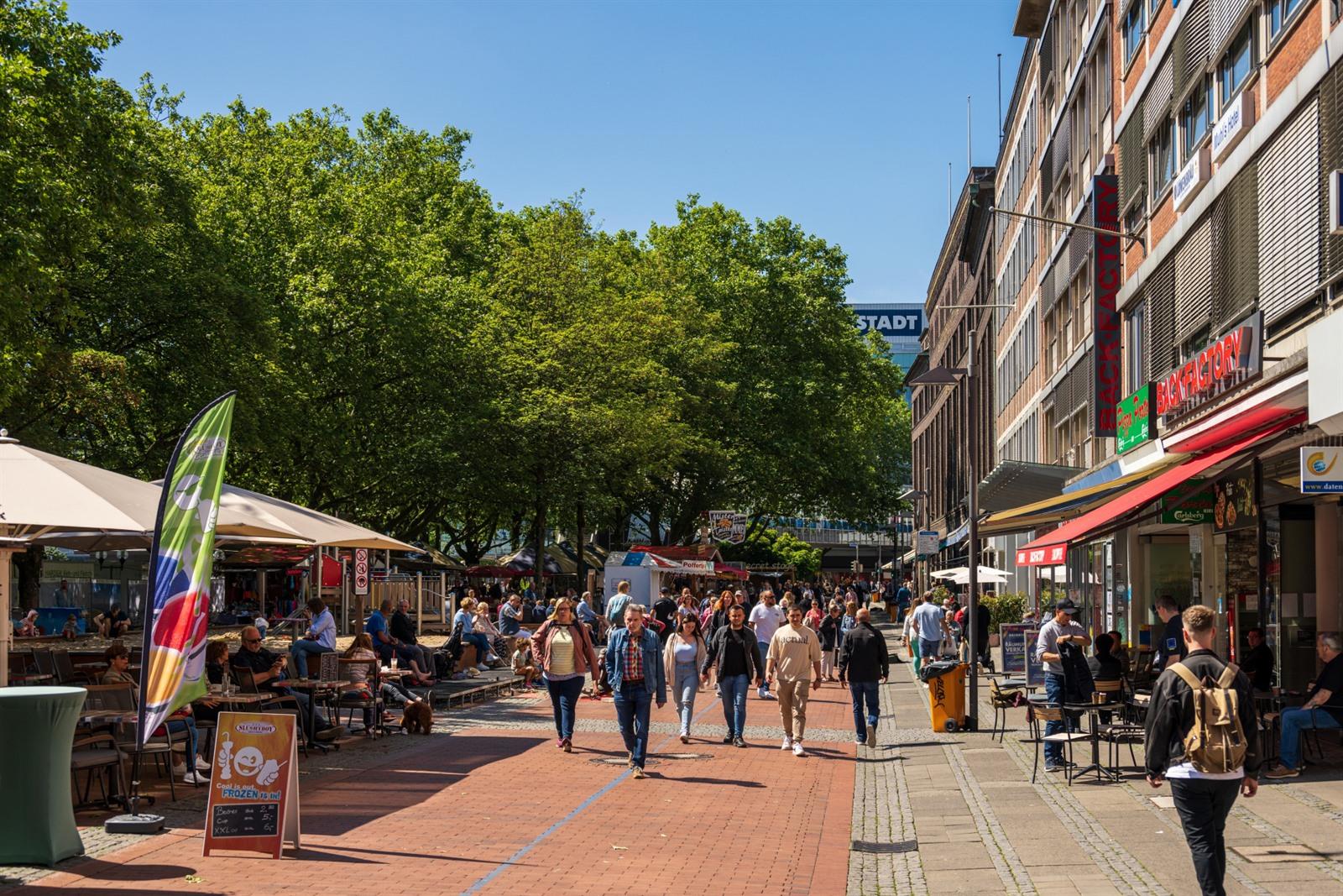 Het kloppende hart is Holstenplatz en vooral de aansluitende Holstenstraße, de belangrijkste winkelstraat van de stad. Hier heb je grote ketens en af en toe wat kleinere winkels, ideaal om je stadswandeling even te onderbreken. Net naast de hoofdas ligt Holstentörn, een modern winkelgebied met overdekte passages. Wie graag wat sfeer meepikt, wandelt door naar de Alter Markt. Hier draait het minder om shoppen en meer om de gezelligheid. In dezelfde buurt ligt ook de Dänische Straße, waar boetieks, speciaalzaken en cafés zorgen voor een rustiger, verfijnder winkelgevoel.