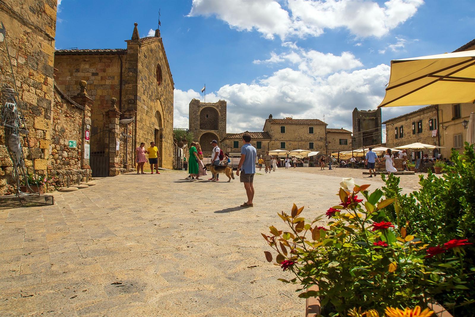 Precies in het midden van het dorpje ligt het centrale plein Piazza Roma. Monteriggioni is amper een handvol straatjes groot, dus zodra je het dorpje binnenwandelt, kom je er zo op uitgewandeld. Je komt uit op een geplaveid pleintje, omringd door oude stenen huizen, met houten luiken, uitzicht op de kerk, en een paar café’s met terrassen waar je even iets kan drinken. Het lijkt misschien eerder op een gezellige binnenplaats dan een groot dorpsplein, maar dat is wat het in onze ogen juist zo charmant maakt. Hier bevindt zich ook de toeristische dienst.