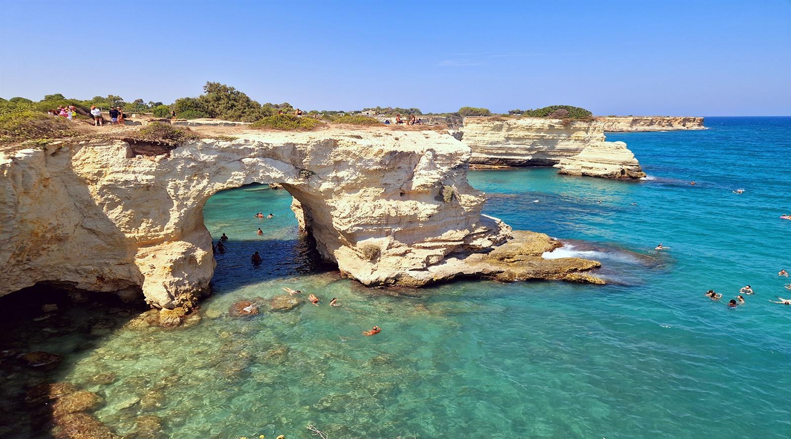 Salento, het zuidelijkste punt van Puglia, wordt omringd door de Adriatische en Ionische Zee. De kust is een mix van uitgestrekte witte zandstranden, verborgen baaien en indrukwekkende rotsformaties. Sommige stranden hebben ligbedden, parasols en strandbars, andere liggen rustig en ongerept. Bij de meeste stranden en baaien kan je zwemmen, snorkelen of gewoon een paar uur genieten van de zon in een mooie omgeving.